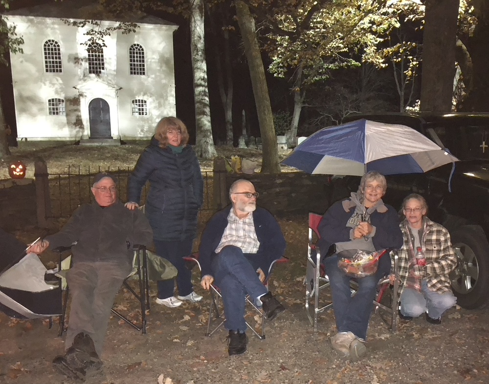 A small but mighty crowd of parishioners park in front of Old Trinity every Halloween to make sure there is no vandalism… and to hand out lots of candy.